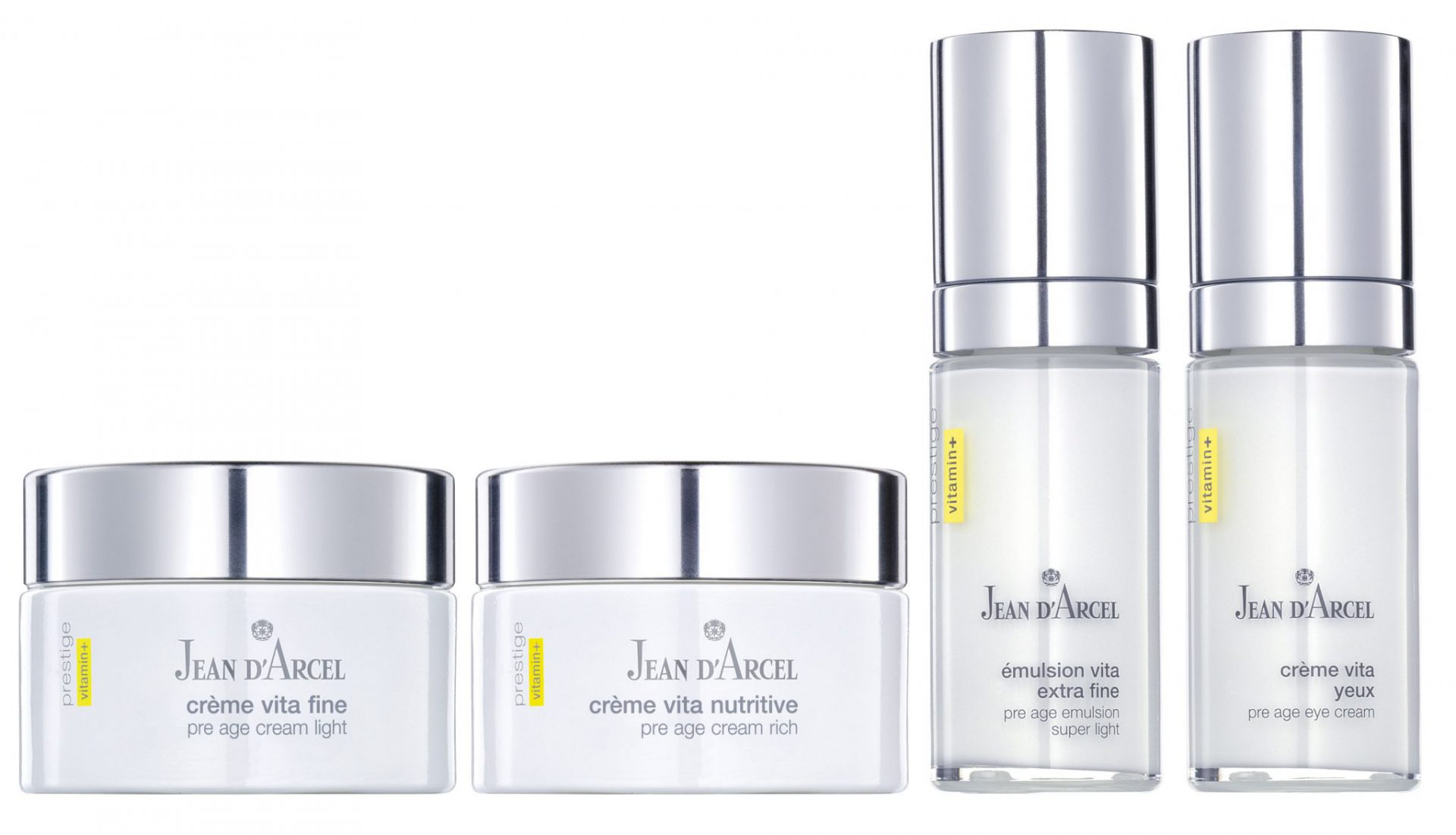 Weer nieuwe frisheid aan de huid geven? De Prestige lijn van Jean d’Arcel zorgt ervoor dat de vermoeide huid weer verfrist en een gezond en jeugdig uiterlijk krijgt. Ervaar de kracht van vitamines en combineer de kracht van een zeer effectieve cocktail van de schoonheidsvitamines C, A en E met intensieve, werkzame anti-aging stoffen, duurzame hydratatie en waardevolle verzorgingscomponenten.