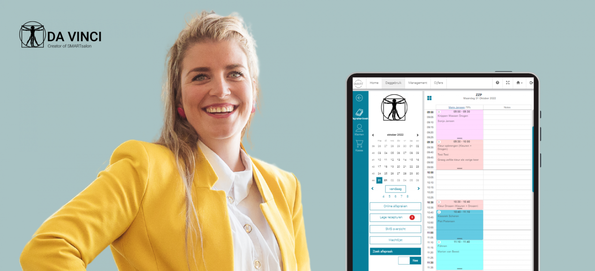 En wie Da Vinci is? Da Vinci maakt al 26 jaar salonsoftware speciaal voor de beautybranche. En is daarmee een familiebedrijf dat inmiddels gerund wordt door 3 zussen. Met een maandabonnement en fijne klantenservice loop je dus nooit een risico en blijf jij de baas over je eigen beslissingen.